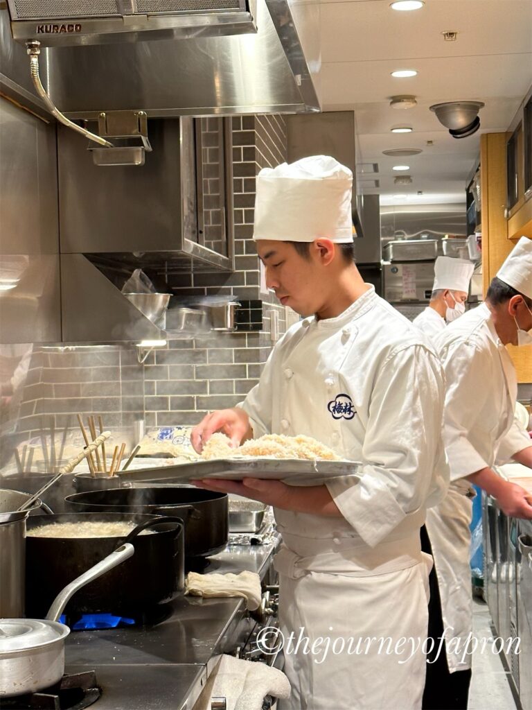 廚房設計成開放空間,師傅們各司其職,有的負責豬排前製、有人專職油炸、有些負責擺盤…..各自敬業但默契十足,在日本用餐的樂趣之一便是欣賞各家廚師的匠人風範。