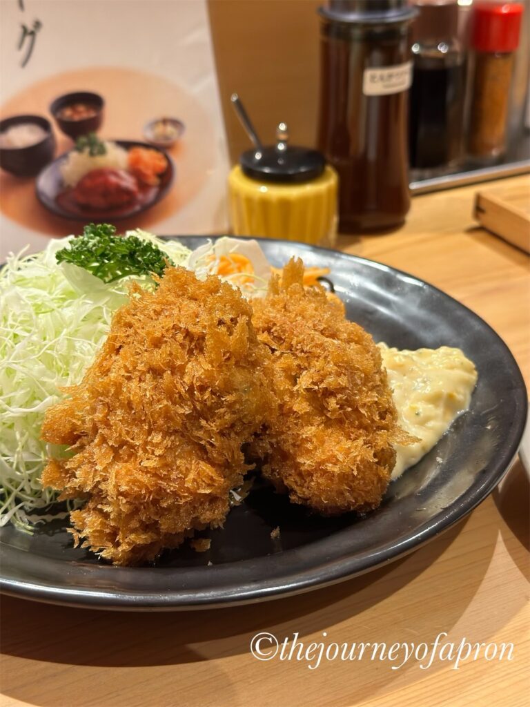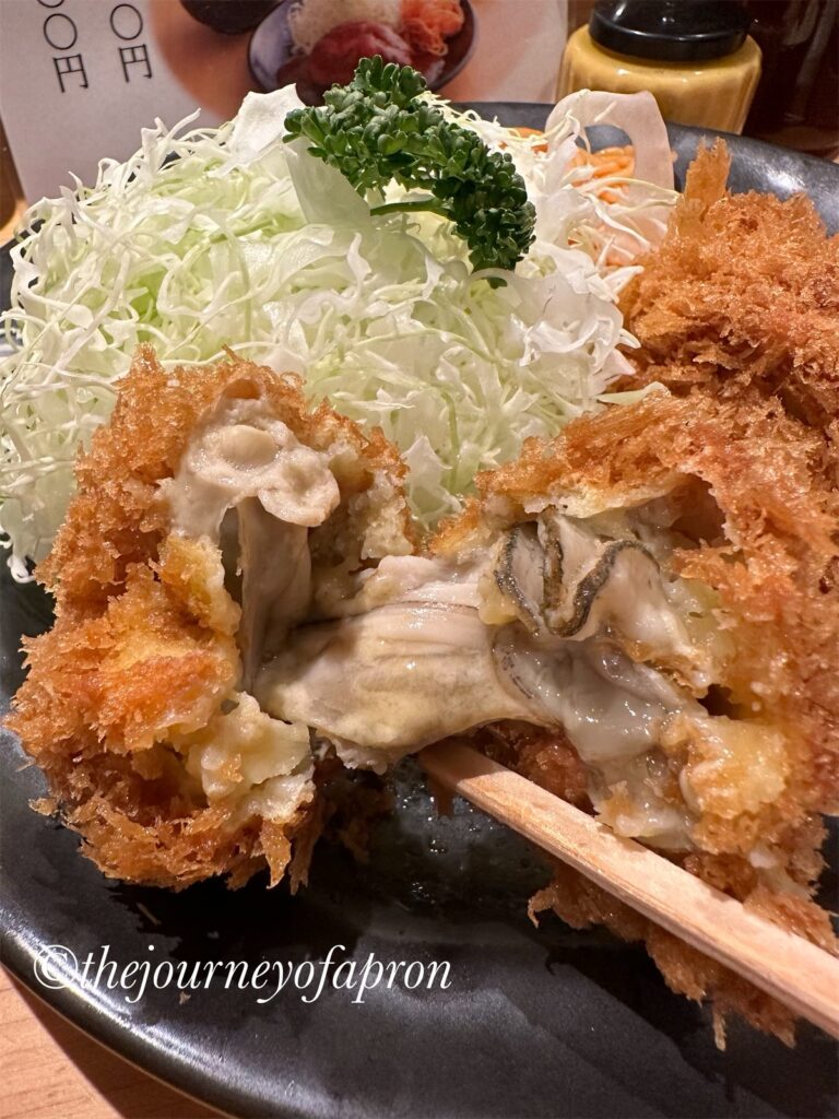 炸牡蠣是是季節限定外加數量限定的商品,我倆當然不願錯過。這裡的作法不同於台式裹乾地瓜粉油炸蚵仔的邏輯,是用跟炸豬排類似的裹麵包粉酥炸手法,酥脆爆漿、粒粒渾圓飽滿,吃起來鹹香過癮!不過我個人認為牡蠣軟嫩,而麵包粉炸後的外皮相形之下就顯得有些刮嘴,我不是很適應。但廣島炸牡蠣似乎就是這種口感,不能說人家不好吃、是我自己吃不習慣。
