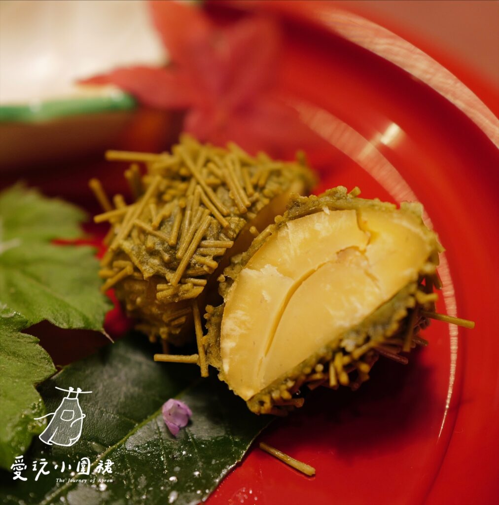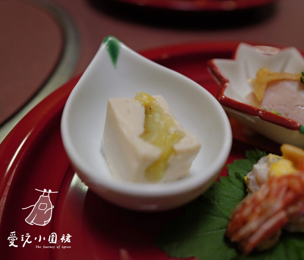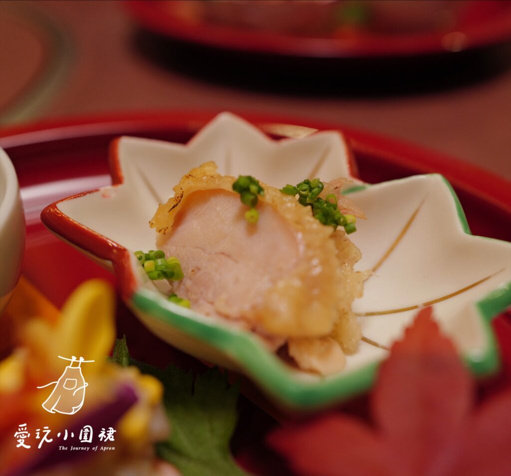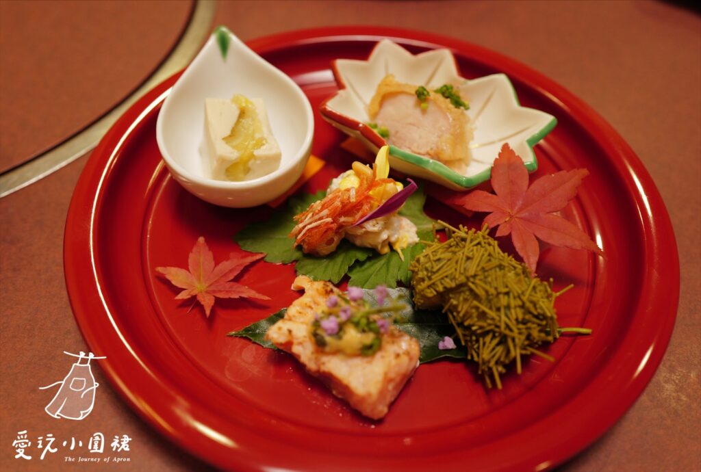 再來是開胃小點(前菜:ぜんさい),有雞肉、車蝦海帶起司、秋鮭、茄子豆腐和栗子。