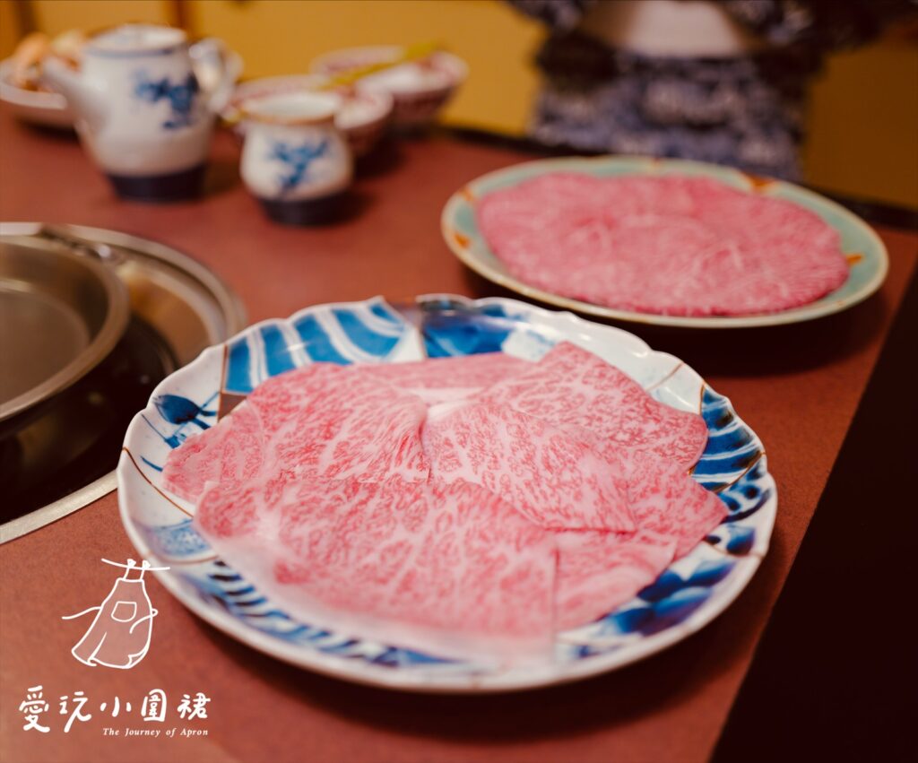女侍以優雅的口吻介紹壽喜燒的食材與料理方式,這牛肉片的油花一看就貴氣!