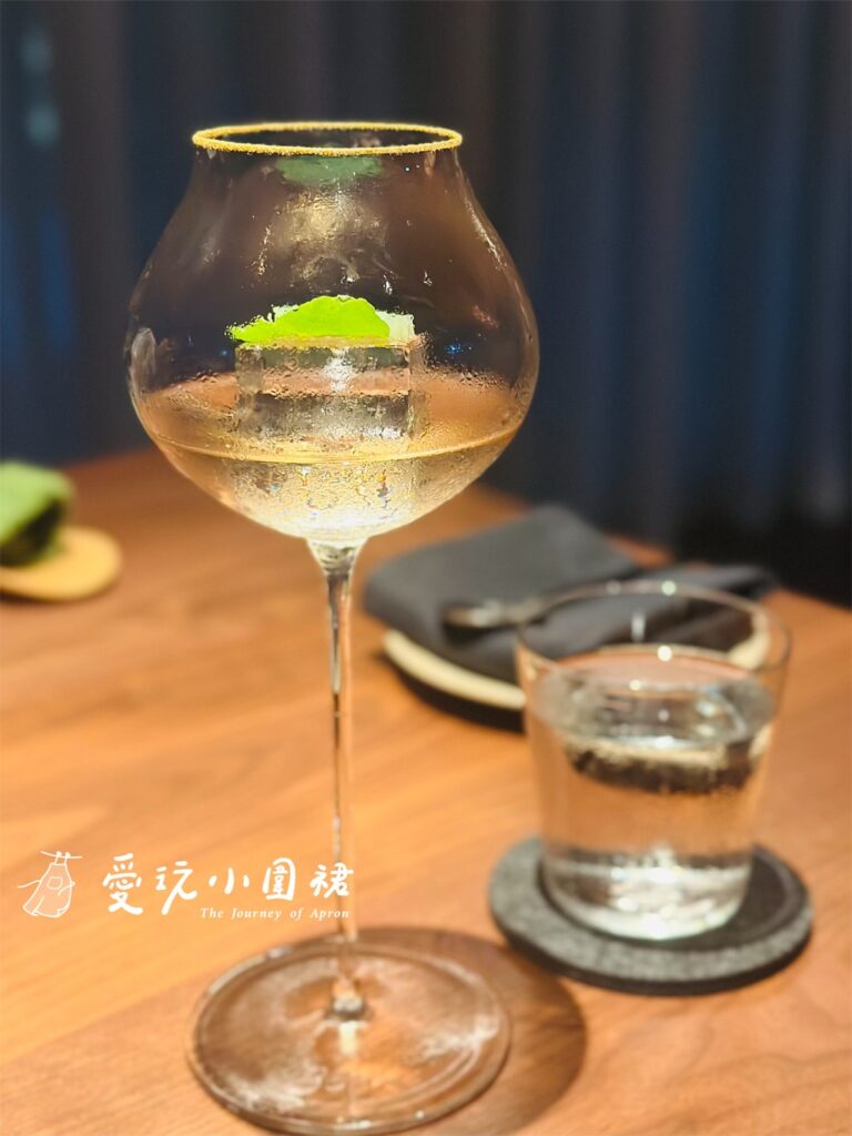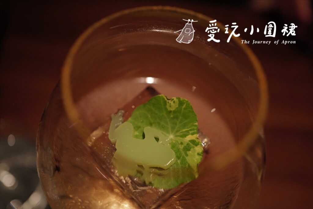 第二款飲料搭配「荷田」,杯口是炙烤過的蝦殼及鹽巴,青蛙果凍用的是金蓮花和山葵葉,飲品是三峽碧螺春綠茶加新鮮蓮藕,帶有海苔和綠豆的清香,利用過濾和調酒技巧,創造出微酸和清香的蓮花尾韻。