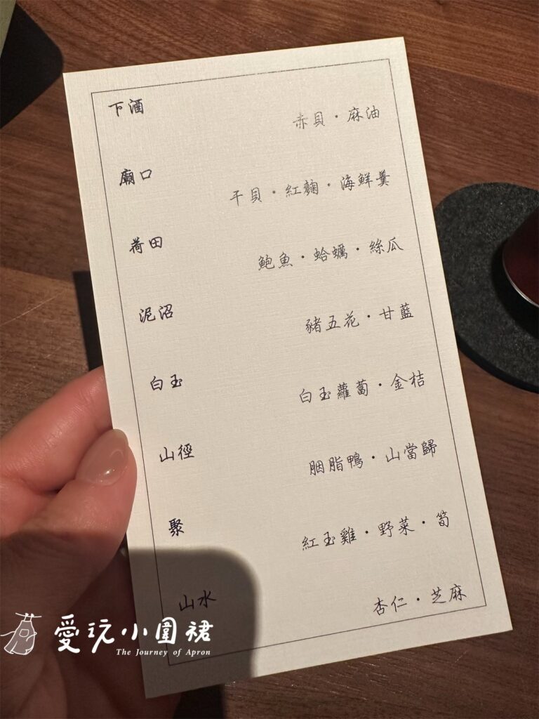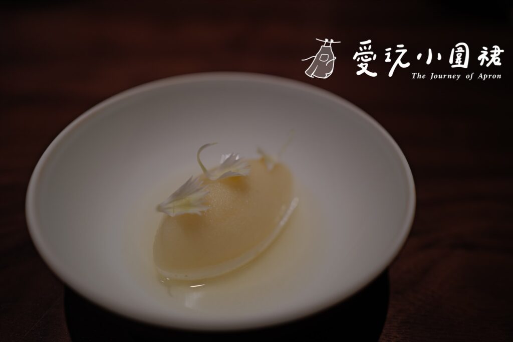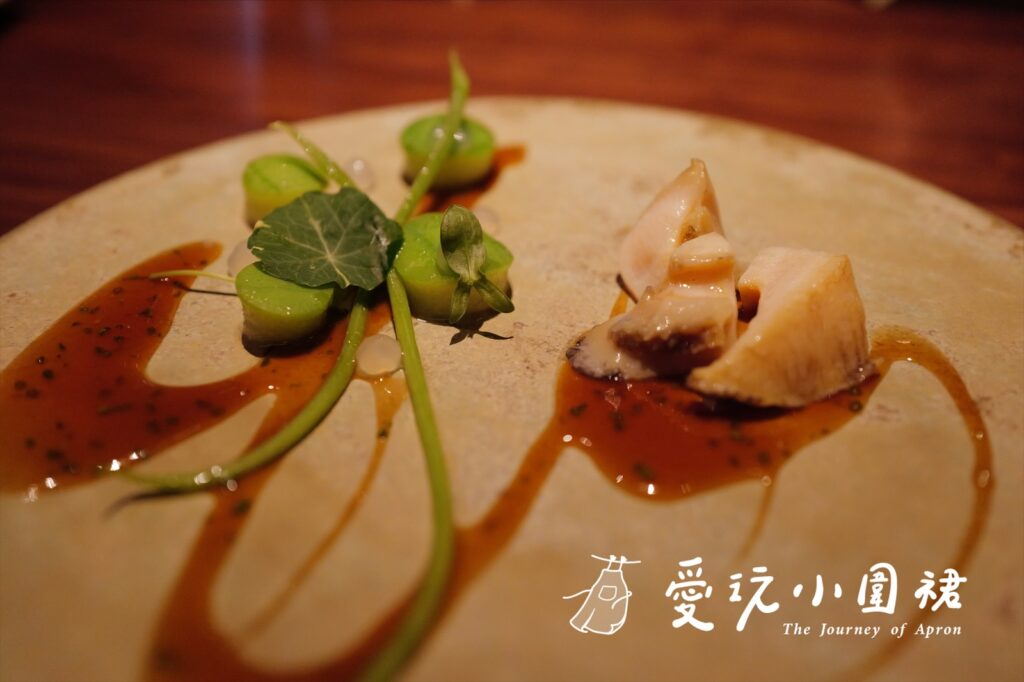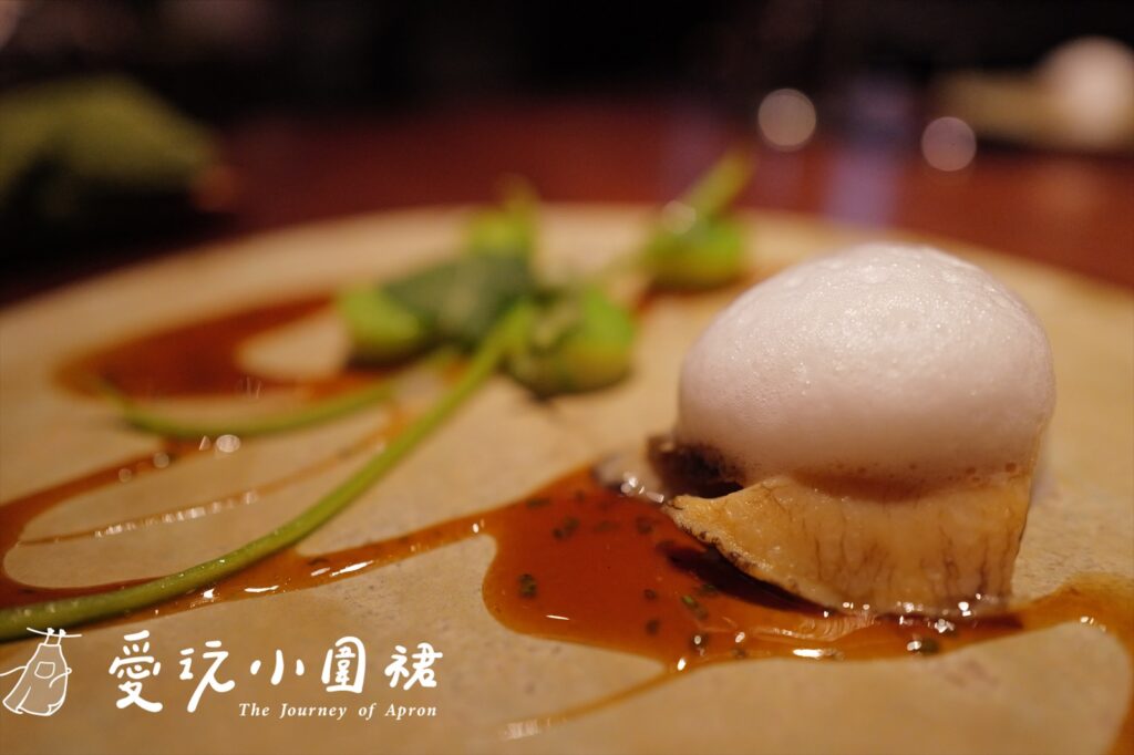 「荷田」。想像清晨薄霧尚未散去、漫步在荷塘邊的景象。風味主軸是在地蛤蠣絲瓜,仿製荷葉的絲瓜脆口清甜、鮑魚則是軟嫩彈牙,水波紋是蛤蠣絲瓜製成的醬汁,再利用芥末粉的苦韻增加風味層次,淋上的蝦皮泡沫是趣味亮點、鹹香怡人。我個人覺得這一道菜品在視覺上的震撼和享受勝過於味蕾上的滿足,但總體而言還算喜歡。