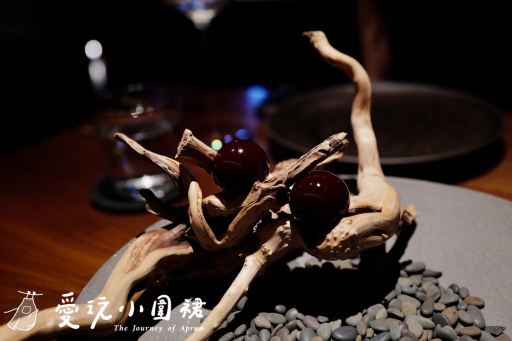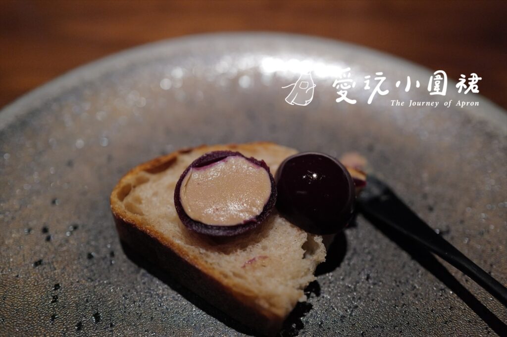 「樹葡萄」。外層透亮果凍狀的是發酵後的樹葡萄汁和水果醋,裡面是鴨肝醬。利用台式香料八角、月桂葉等,試圖營造出台式滷味的香氣。整顆晶球其實是酸麵包的抹醬,精緻而美麗,搭配上也很用心,可惜香料氣息及鴨肝醬香都過於寡淡,少了令人回味的餘韻。