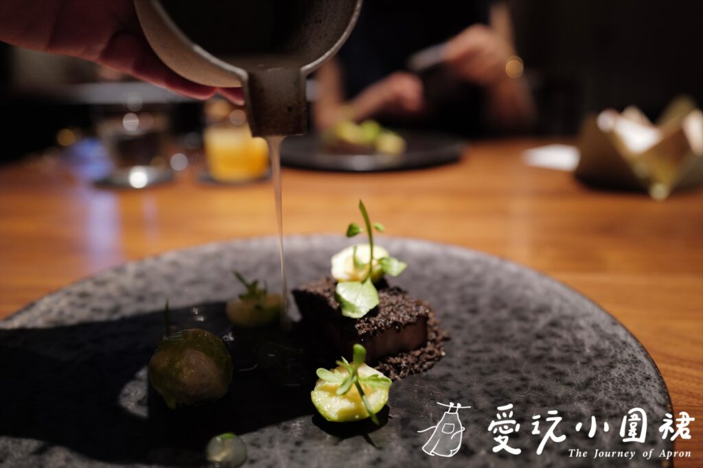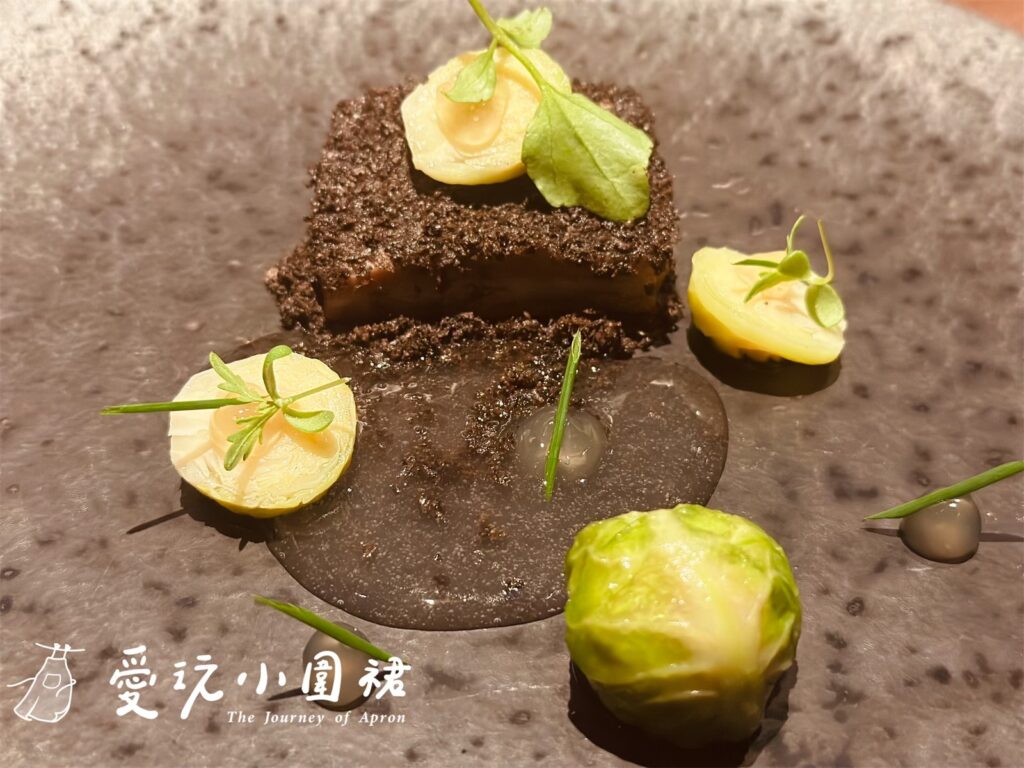 這一道菜品驚喜滿滿,可惜味道似乎辜負了顏值,黑芝麻與五花肉的組合,我個人覺得有點膩口,臭豆腐沒有處理好,吃得出豆腥味。但換個角度想,年輕主廚的味覺動態範圍很寬、創造力強,當然是值得讚許。