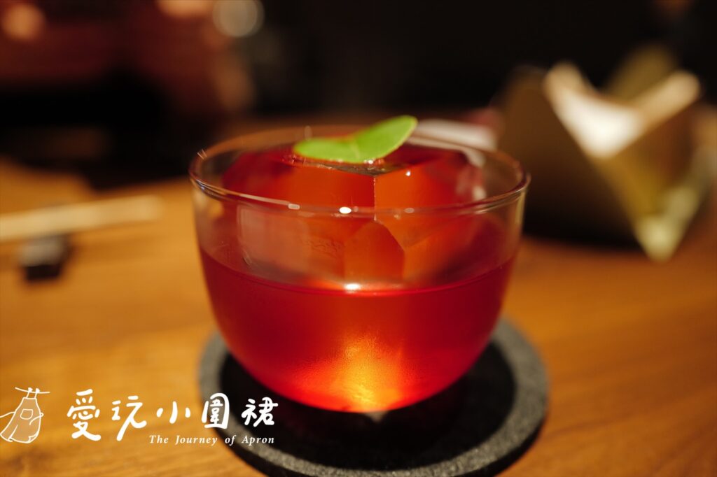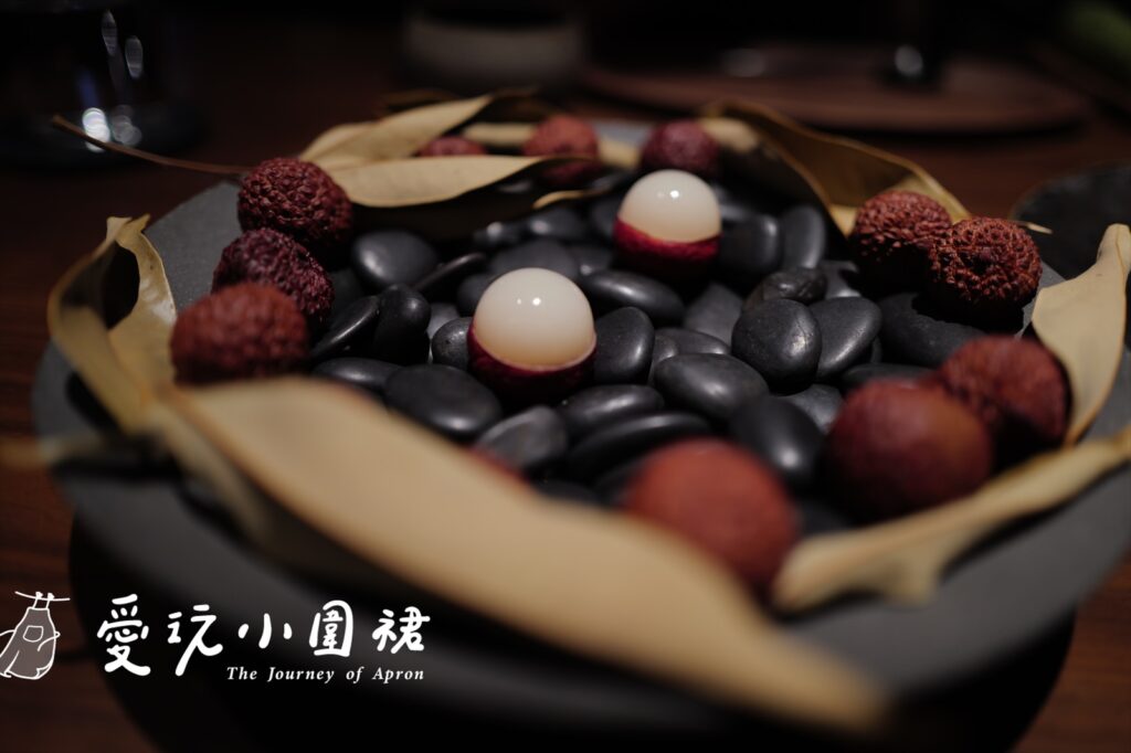 茶點是取自台灣飯後水果文化的發想,以荔枝盤的樣貌呈現,利用玫瑰、荔枝帶出洛神本身的酸度,底下則是泡芙;甜點是紅玉布丁,以雨後的路上水灘為設計出發點,金箔比擬落葉,傳遞大雨一場後波光粼粼的視覺感,再利用內餡的牛蒡氣味隱喻濕漉漉草坪上的清香。