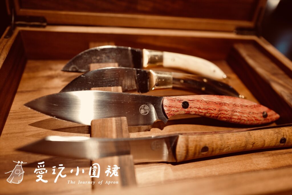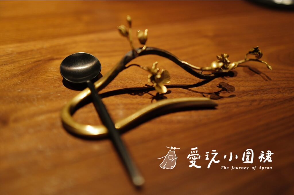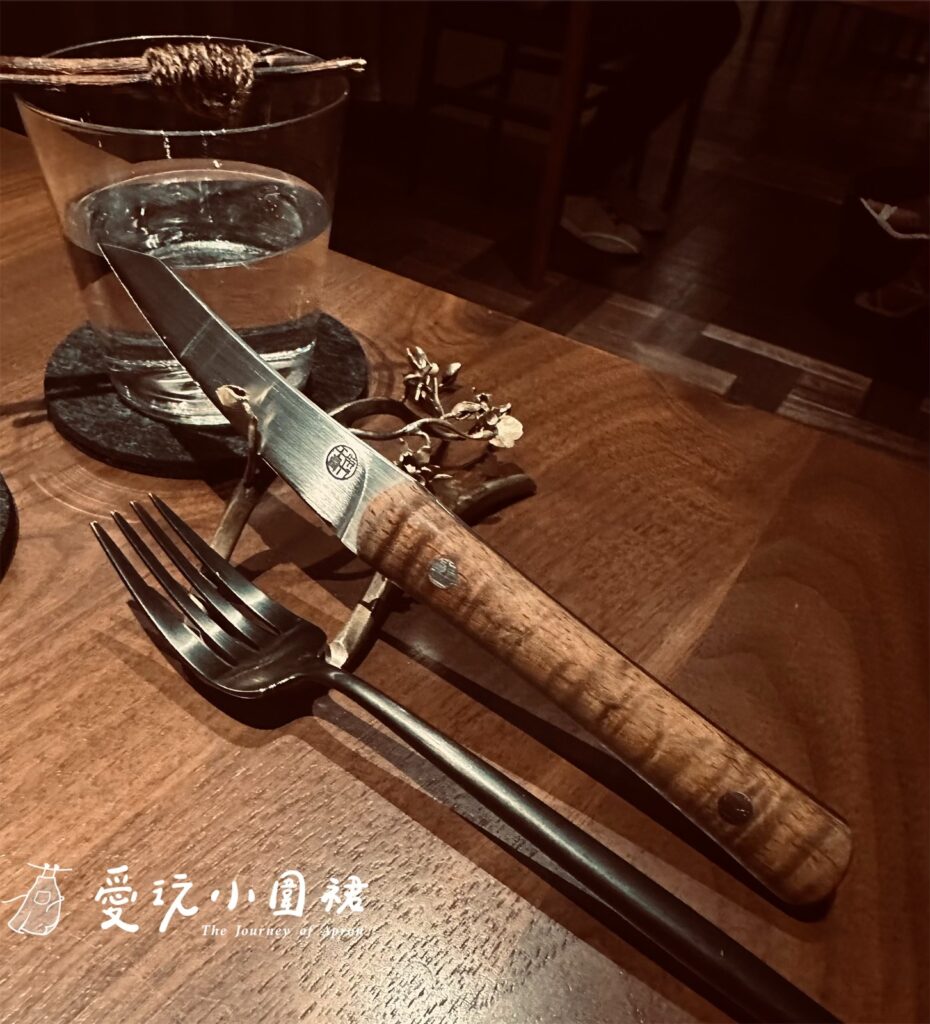 有趣的插曲是選擇主餐刀。有平埔族用以切檳榔的士林刀,也有以鹿角和水牛角製作的款式,隨心挑選一把,陳放在文心蘭筷架上,畫面頗為契合。