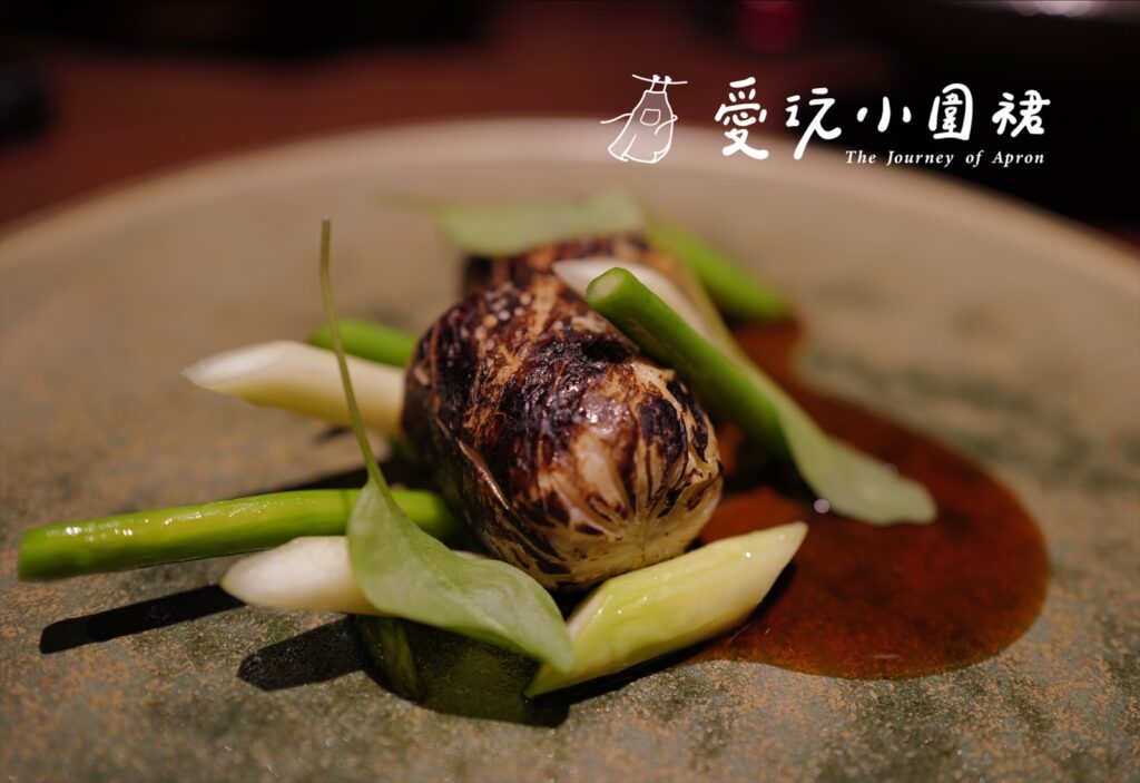 「聚」,這是在山上用炭烤吃合菜的故事情節,也是需要一些想像力的加持。用蘆筍帶出竹林的視覺效果,搭配高麗菜捲雞肉慕斯,淋上香菇筍子雞湯風味的醬汁,旁邊還有一碟是雞頸肉串燒,時蔬則是過貓搭配雞心。