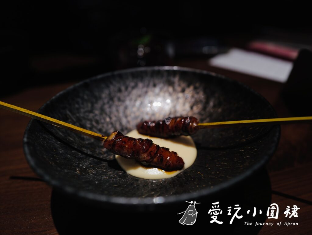 先不管主理人試圖搭建的畫面感,單就菜餚本身來看,單一主餐變為合菜就已經是創意與勇氣兼備的決定。雞頸肉的串燒煙燻感十足,這味道我喜歡;以高麗菜葉包裹雞肉後炭燒,也算是細膩又不失原味;過貓油酥脆口、深得我心,暗藏在底部的雞心口感彈牙,調味更是讓人滿意。