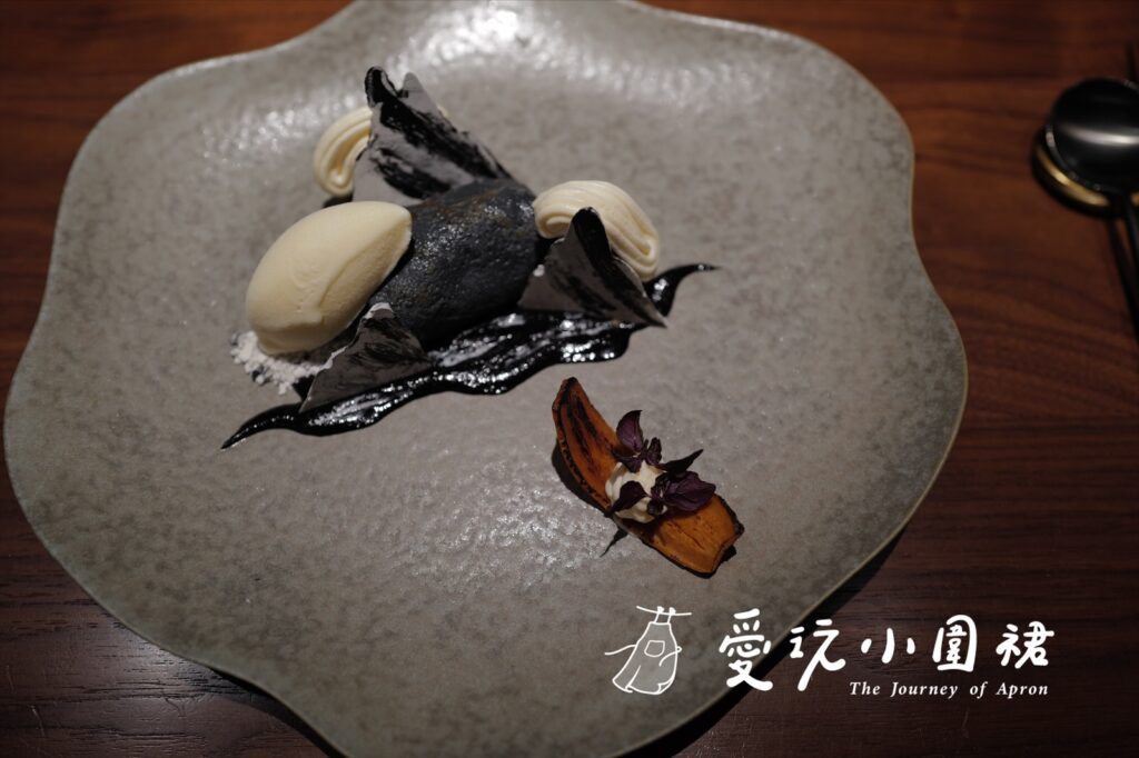 「山水」,以水墨畫方式呈現,是芝麻糊配杏仁茶的解構與再重組。中間是芝麻可麗餅,模擬大石頭的視覺感。石頭旁邊是帶有堅果香的杏仁茶冰淇淋。山巒是蛋白霜,山腰是桂花製成的磅蛋糕。
