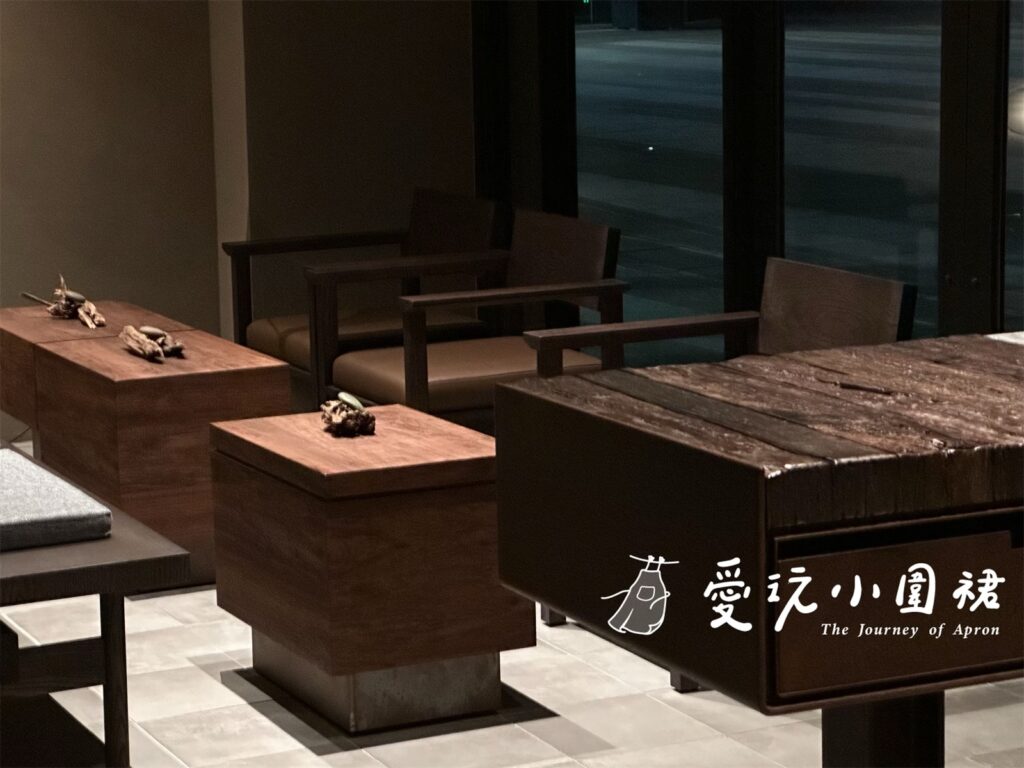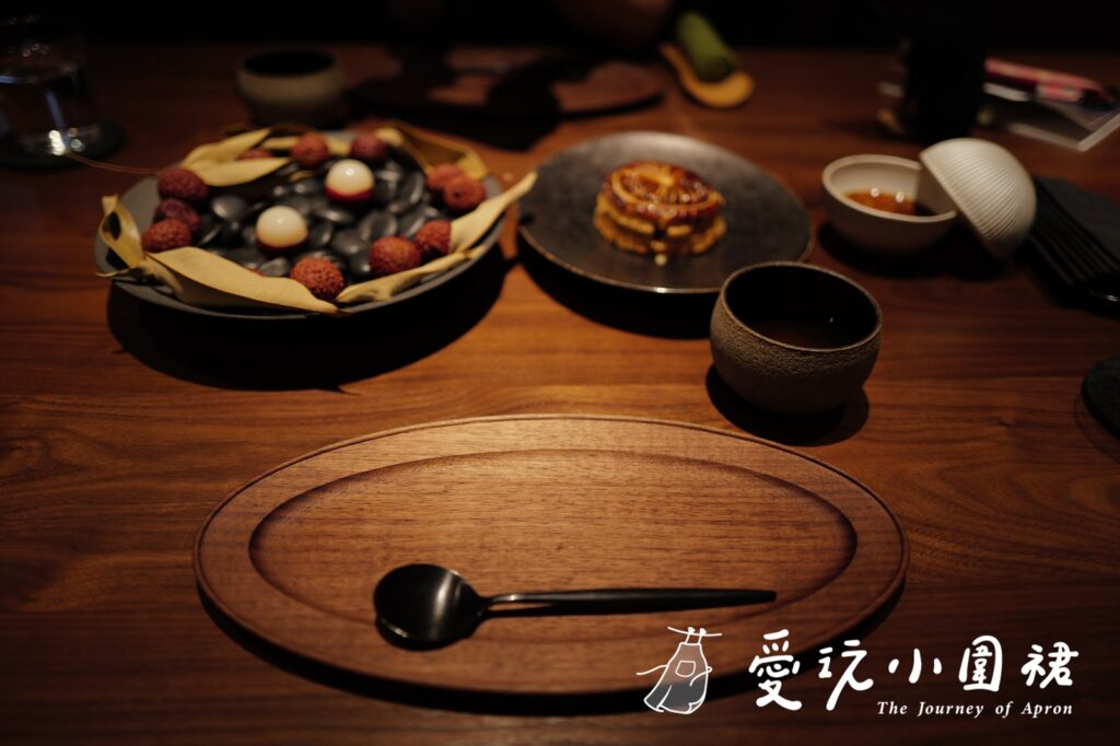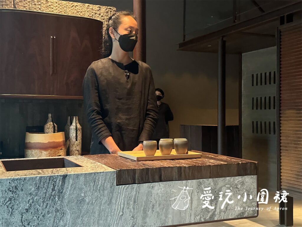 餐廳內部以褐色木質元件為裝潢主調、搭配鏽色鐵器和石板,低調卻有個性。在候餐區飲用冷泡茶後再移駕二樓,用餐空間寬闊、氛圍雅緻靜謐,連背景音樂都很「台灣」。