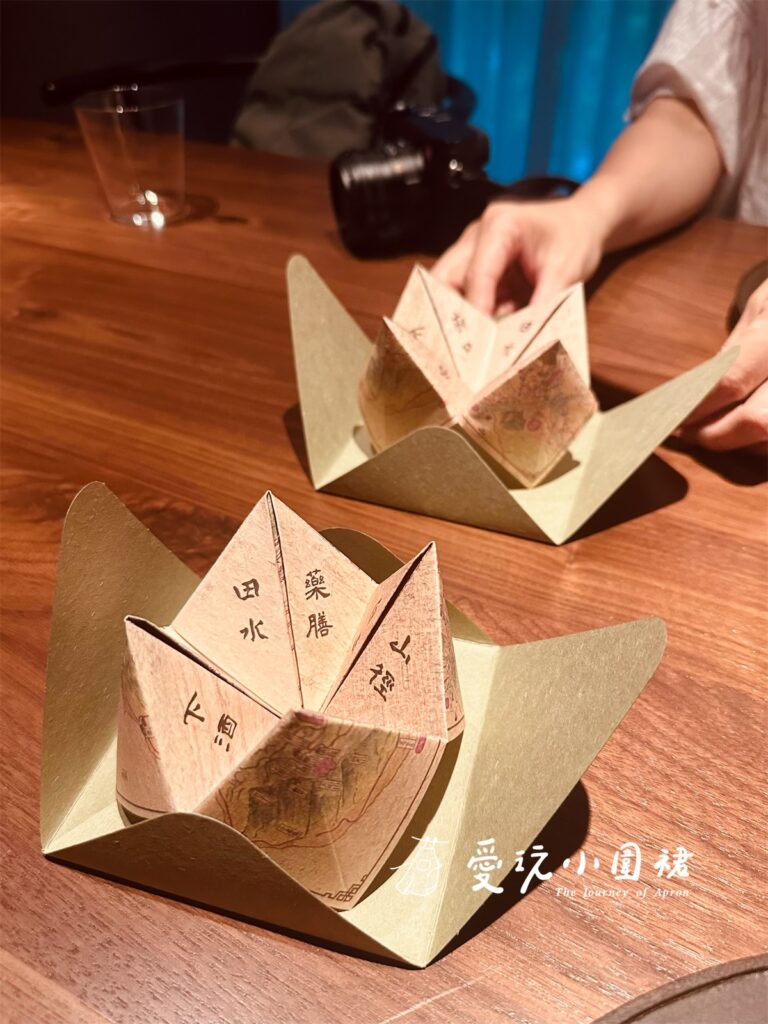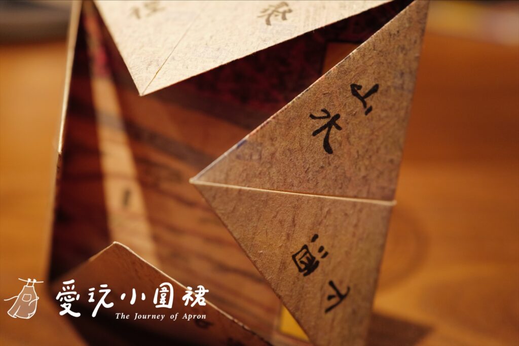 菜單是童年的神奇地圖~東南西北。挺立在桌上的樣子象徵四面環山的台北盆地;再仔細端詳,攤平後原來是昭和時期的台北地圖。