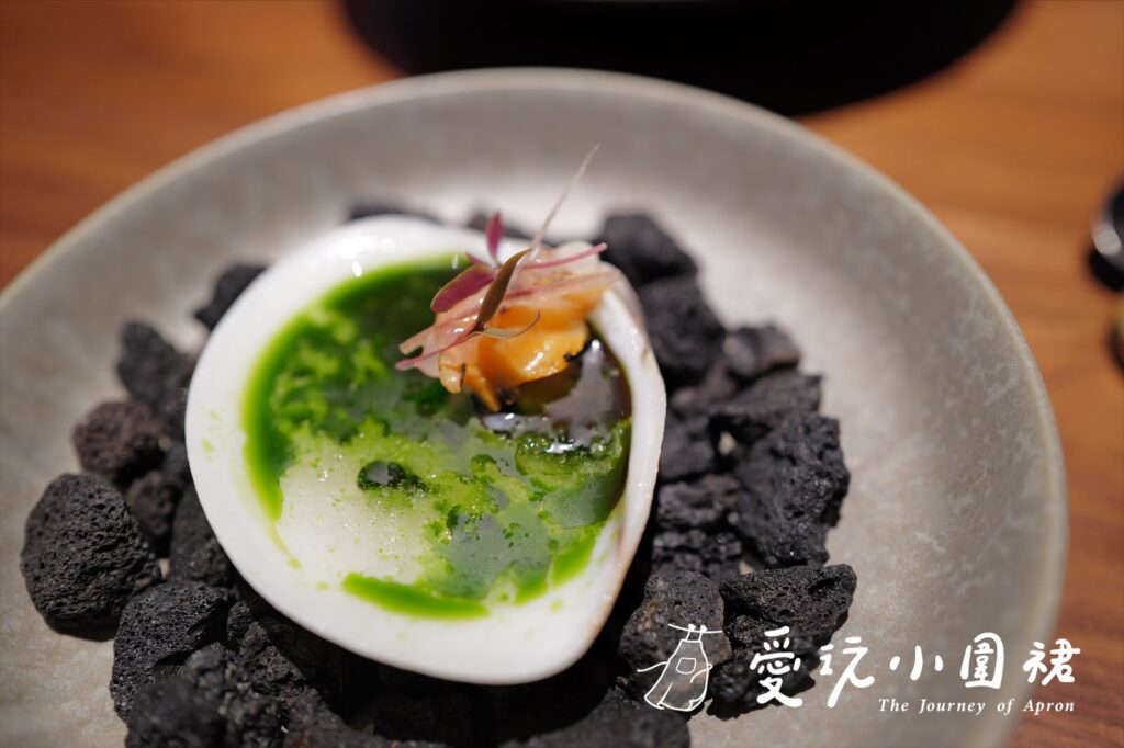 「下酒」。模擬在地人吃飯前的開胃菜。用醬油和香油帶出蛤蜊的鹹香,赤貝和杏鮑菇作為增添口感之用,兩者清甜感相互交織,層次做得很好。斑斕狀的綠是巴西里,草本香氣豐富,但用在這裡我個人覺得似乎有些過猛、撞擊力太大。