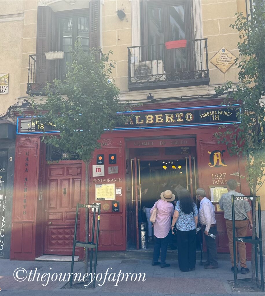 光是從外觀就能確立Casa Alberto的經典地位,集合了所有馬德里小酒館的必備元素,包括塗上紅漆的厚木門、標有業主姓名和街道號碼的門牌,門上的毛玻璃….即使無法入內用餐,小圍裙也強烈建議您在門口多看上一眼。