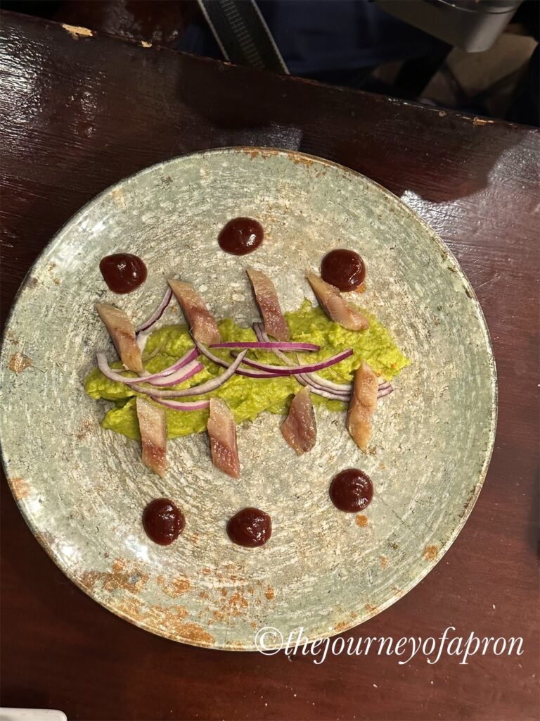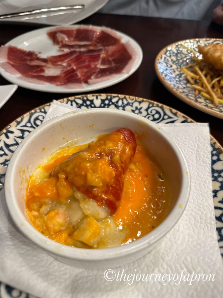 我和蘋果匠造訪當日店內滿座,但也只等了約莫半個小時就能進場,肚子並不太餓的我們僅點了幾道tapas,伊比利火腿、鱈魚、甜椒鑲海鮮、炸花枝三明治和鯷魚,以及一份燉牛膝。