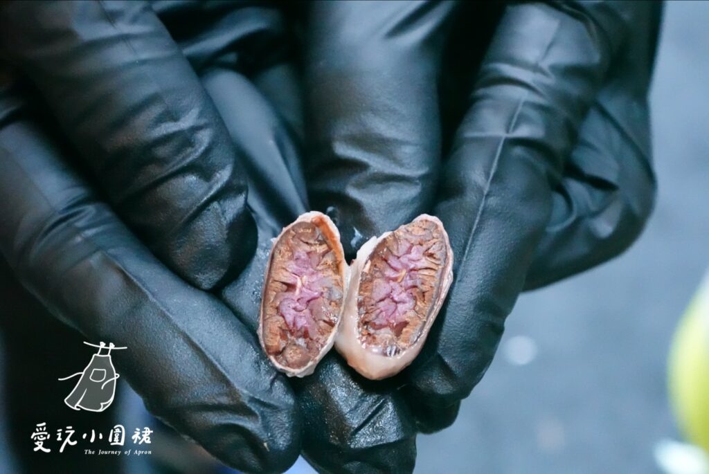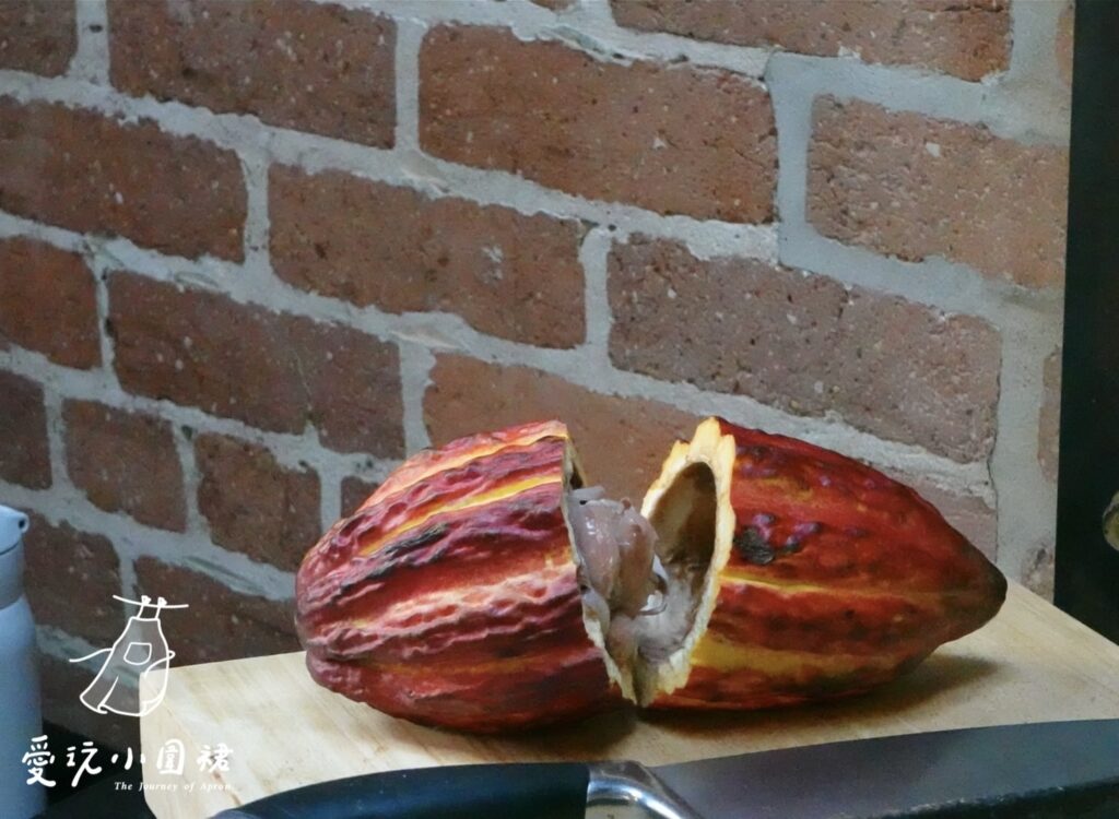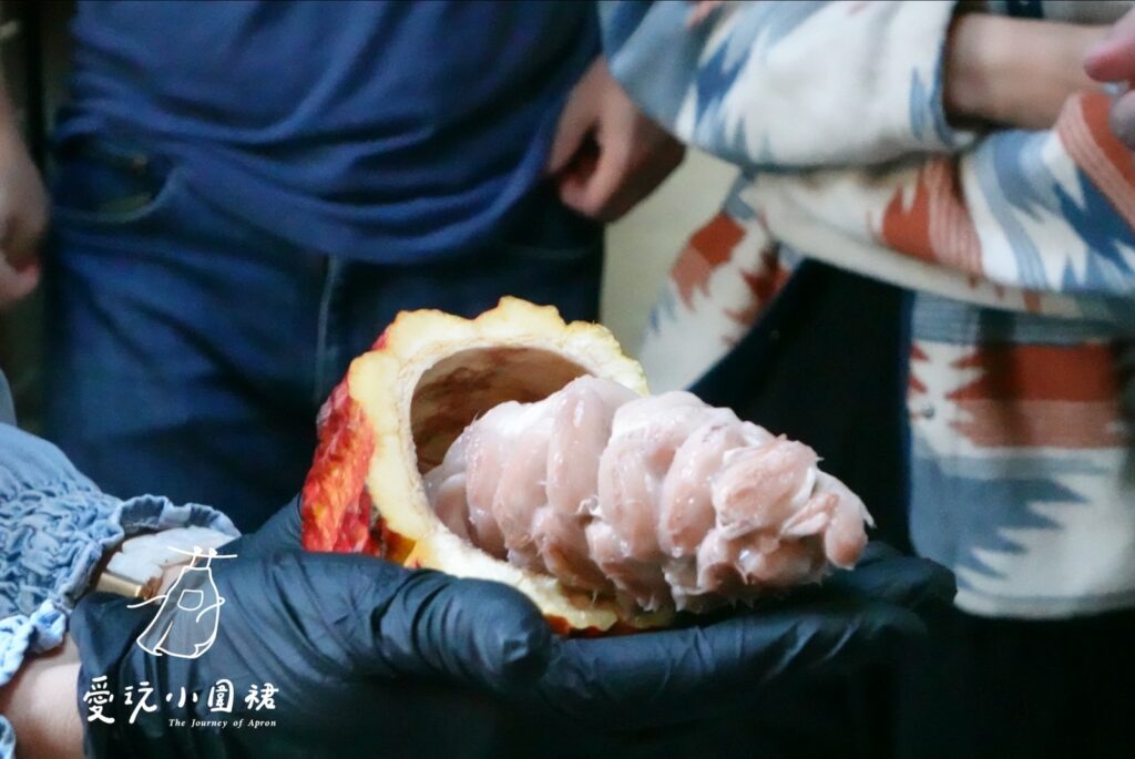 第一次看到新鮮的可可果,剖開後的白色果肉竟然帶著淡淡果香,和我們想像中的巧克力完全不同。