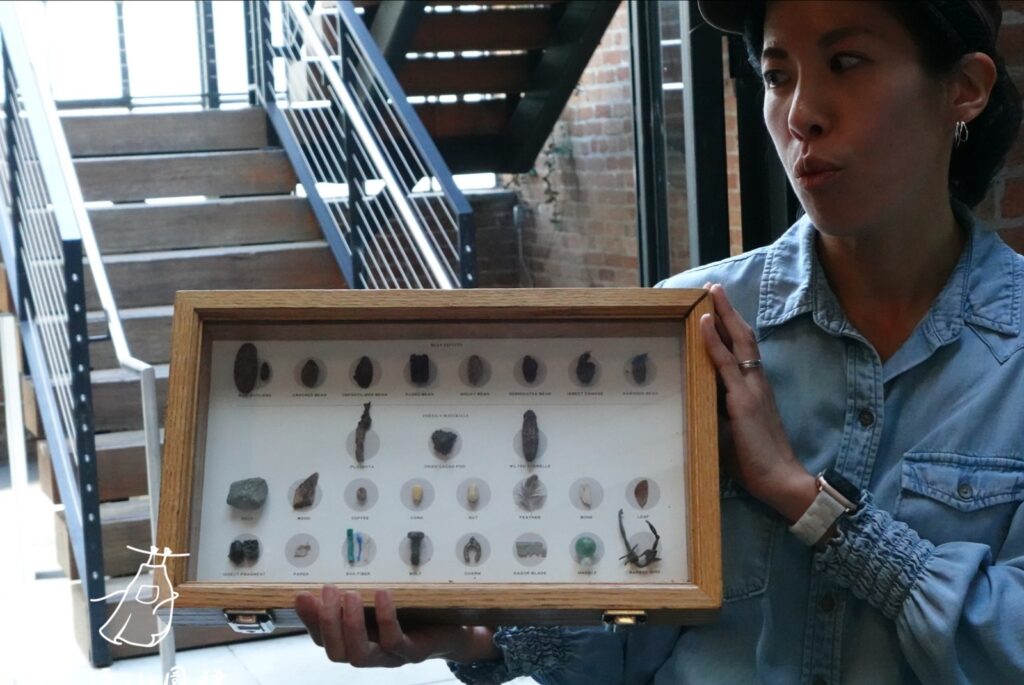 導覽員示範如何從豆袋裡挑出小石頭、木屑、昆蟲殼。每一次挑除,都是讓巧克力更乾淨、更純粹的一步。
