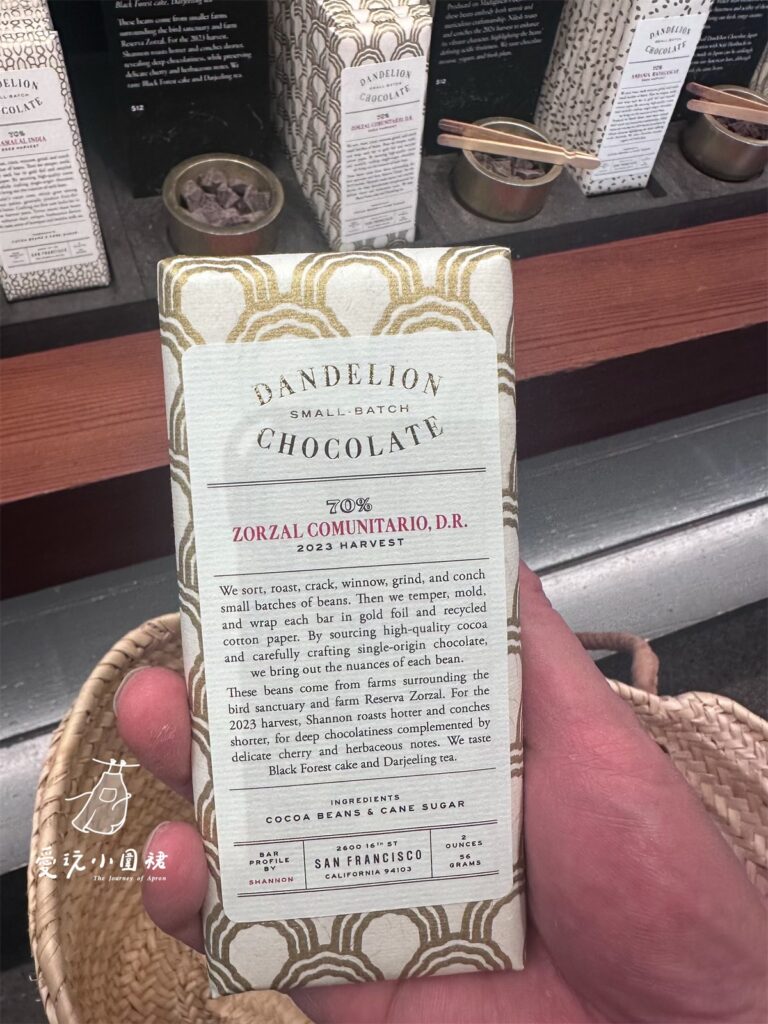 舊金山有一家巧克力控絕不能錯過的工坊——Dandelion Chocolate。他們以「bean to bar(從豆到巧克力)」理念聞名,用最純粹的方式展現可可的個性。整間工坊充滿透明感:玻璃窗後是烘豆、研磨、成型的實作現場;櫃檯前擺著世界各地的可可豆樣本與試吃巧克力。這裡不只是買巧克力的地方,更像是一間讓人「重新認識巧克力」的教室。