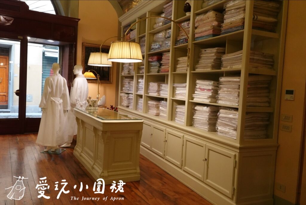 我還買了一件洋裝,腰際間是手工縫出的花樣,獨一無二、煞是好看。Loretta Caponi還販售許多別具匠心的生活選品,像是寢具、桌巾和枕頭套,都是織紋精美,帶點復古溫柔的手工織物。對我來說,Loretta Caponi 不只是一間精品店,更是義大利精湛工藝的縮影。