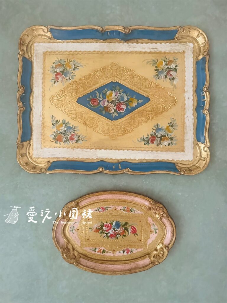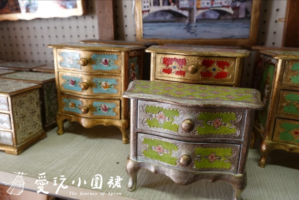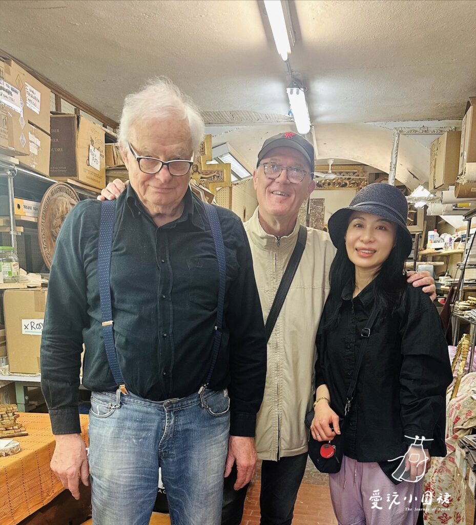 這家店專門製作義大利傳統木質裝飾,每一件商品都是手工上色、描金與刷漆,色彩有著文藝復興畫作般的飽滿與溫潤,金色邊框隱約透著歲月打磨的光澤。店主是一位靦腆但眼神溫柔的老匠人,他用簡單的英語向我介紹自己的作品,還熱情地跟我合照。