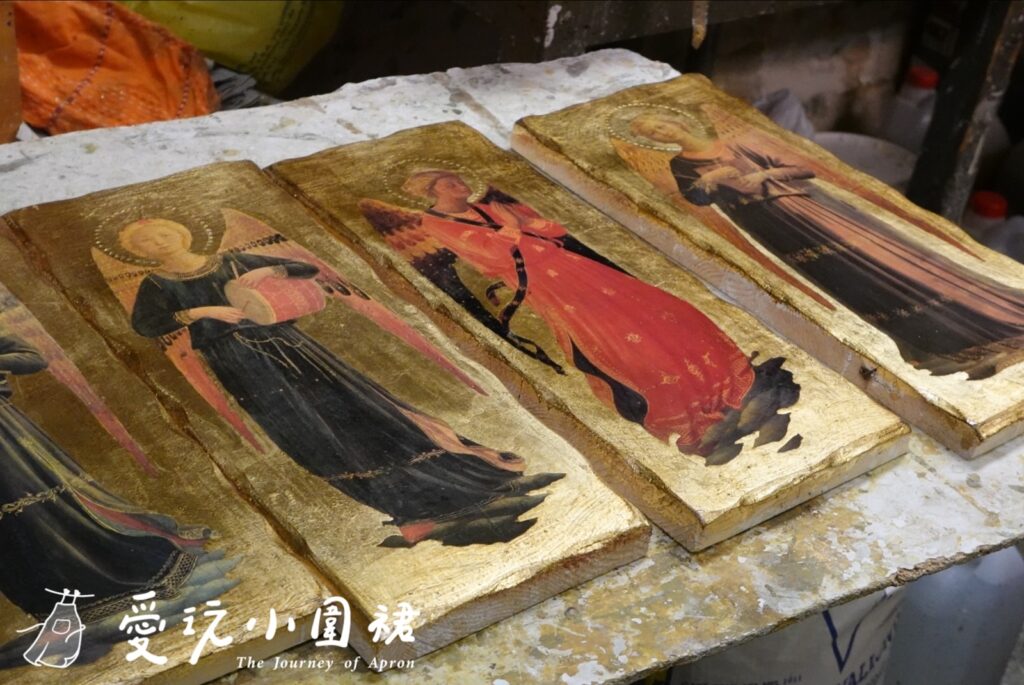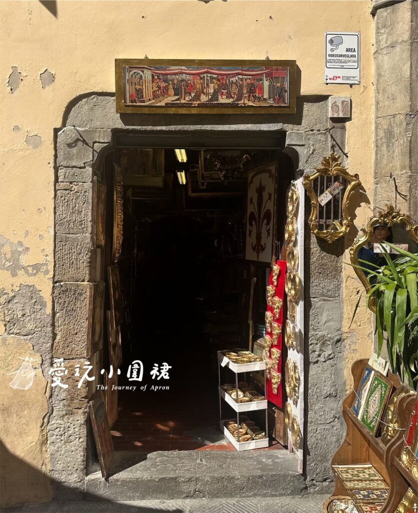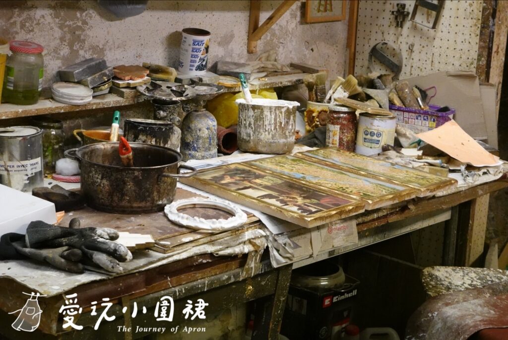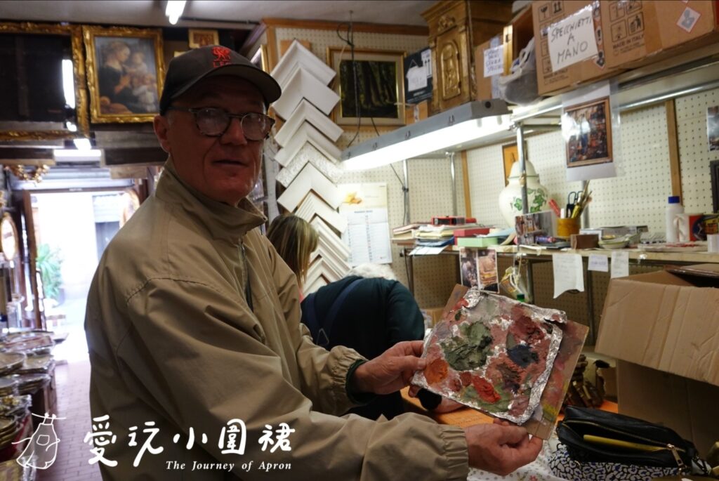佛羅倫斯的老城區總藏著不經意的驚喜,只是閒步的我卻被一間仿若時光靜止的工坊吸引,沒有醒目的招牌,卻充滿藝術氣息。屋裡散發出淡淡的顏料味,牆面掛滿鏡框、聖像與畫作,工作桌上是亂中有序的色料罐、刷具與未完成的木器作品。