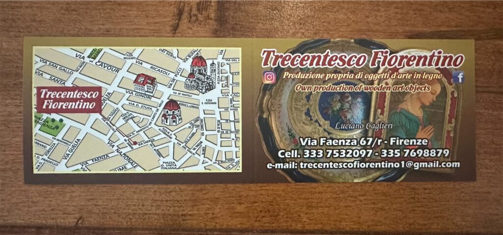 其實佛羅倫斯熱門景點周邊的紀念品店也有賣這類托盤,但這裡賣的是純手工製作,明顯精緻許多,而且價錢相當實惠,唯一麻煩的就是地點不太好找,我記得是在聖十字區,但實際地址似乎Apple map會指引錯誤,旅人們或許用獵奇的心情,依循名片上的地圖走訪一趟吧。