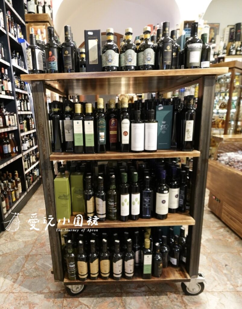 木架上陳列著數種橄欖油,店員如同侍酒師般,細細介紹每一款的果種與風味層次,從香氣馥郁到微苦辛辣,選擇真多!可貴的是酒舖裡陳列的橄欖油幾乎都是來自小作坊,產量少、品質精優。我挑選了三款來自托斯卡納不同產區的特級初榨橄欖油,各具風格,帶回家慢慢搭餐品味。