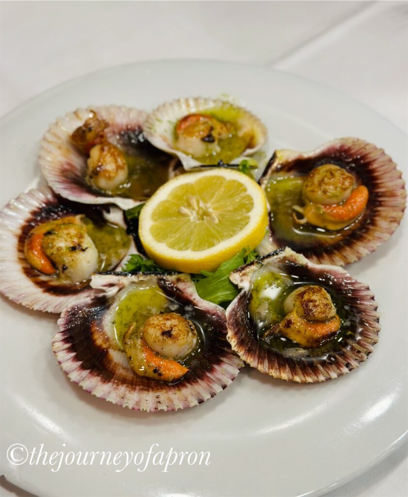 烤扇貝是店老闆推薦的。加利西亞是貝類的主要生產國之一,優質的水域育養出豐壯飽滿的扇貝,這盤裡個個都是大塊頭;簡單的做法和樸素的調味是襯托食材鮮美的不二法則,油烤是最傳統也最合適的烹調方式,佐料僅用橄欖油、鹽、檸檬汁,每口都鮮甜到讓我神魂顛倒、好吃得不得了。