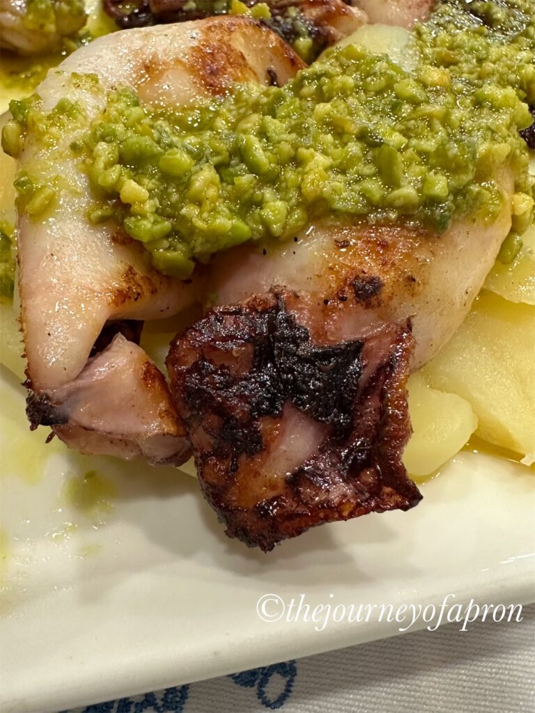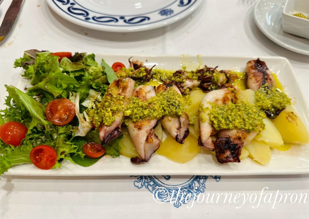 O’caldiño的小烏賊非常好吃,炙烤後淋上橄欖油和帶有顆粒的開心果醬,堅果香與焦香的組合相當迷人,鋪底的馬鈴薯也是綿滑細緻,這一道菜做法簡單,但是口感紛呈、色彩斑斕,視覺和味覺都是美的享受。