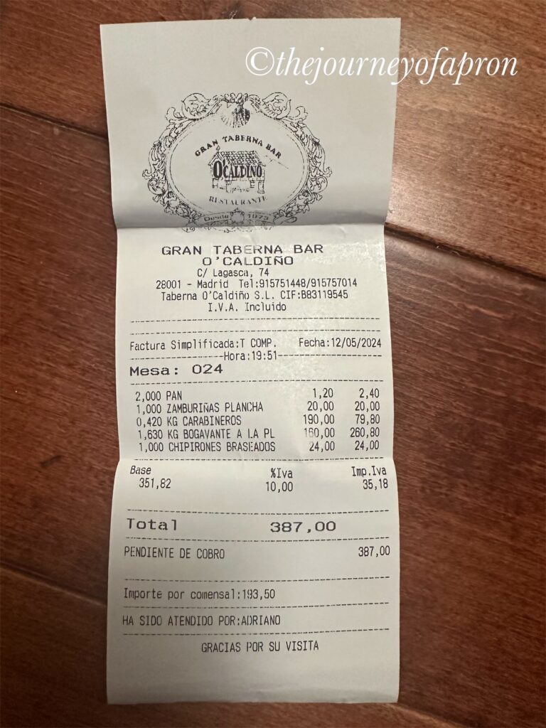 至於價位方面,其實O’caldiño並不是高價位餐館,只是因為蘋果匠點了一尾260元的龍蝦(每公斤160歐元),和兩隻較高單價的西班牙紅魔蝦,所以總價看起來比較多。實際上O’caldiño是很實惠的餐廳。