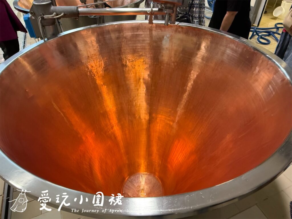 起司塊會在銅槽底部沉澱、凝成一團,凝結的酪蛋白撈出後以模具定型。