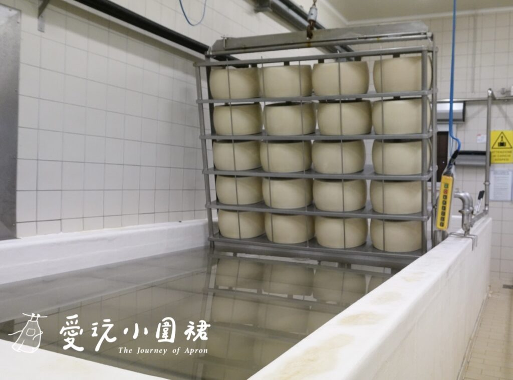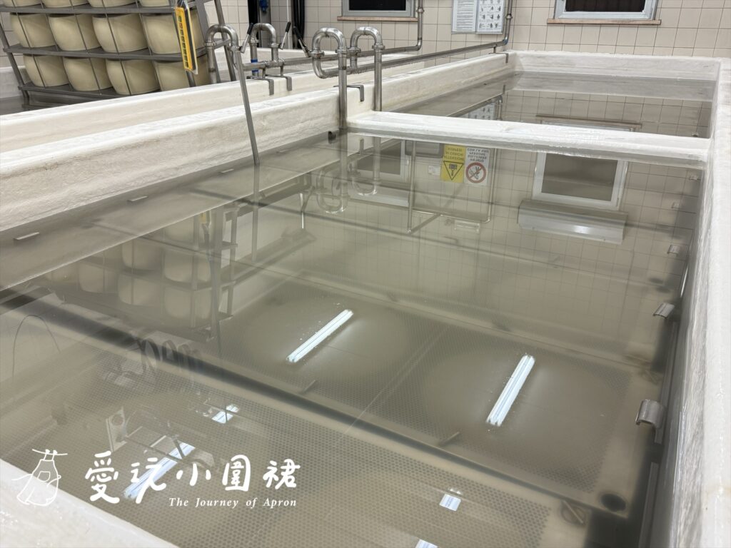 起司胚在鹽水中浸泡約20天,以幫助形成外皮並提升風味。