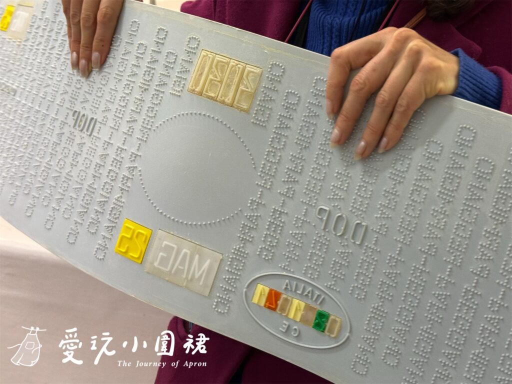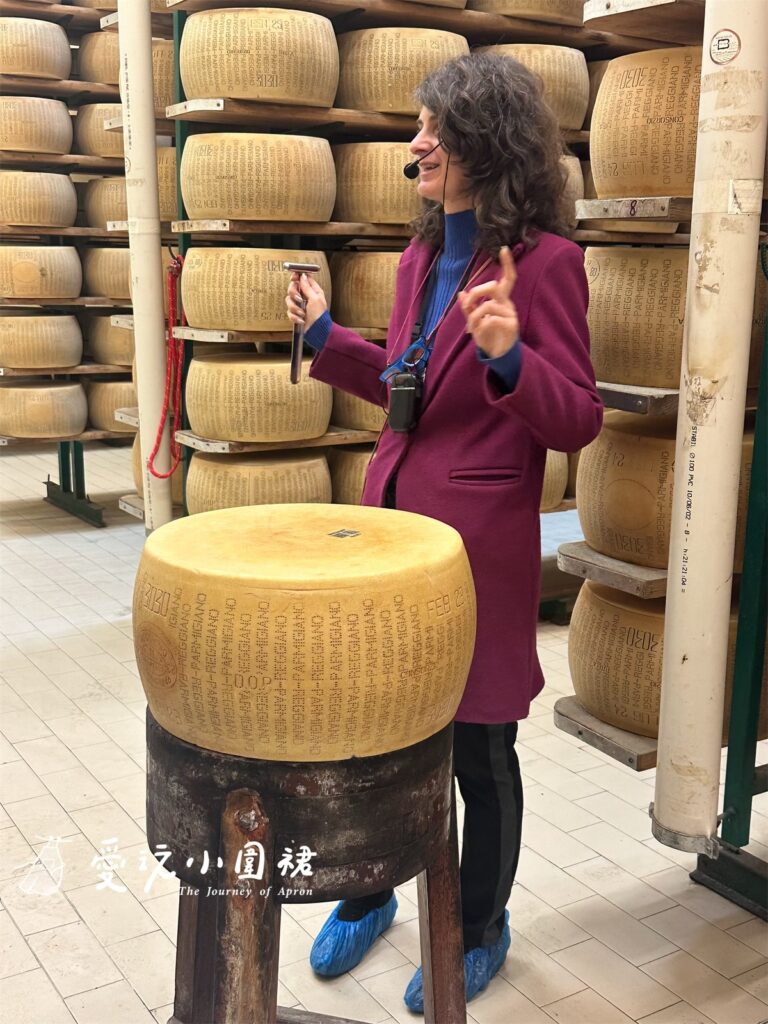 熟成完成後,每塊帕馬森都需通過專業檢驗師的「敲擊測試(battitura)」,透過聲音判斷內部是否均勻無瑕。檢驗合格後,外皮上會燙印出「Parmigiano Reggiano」、生產日期與乳酪廠代碼等資訊,這些其實早在起司尚未成形時,就以浮雕模板壓印預留。