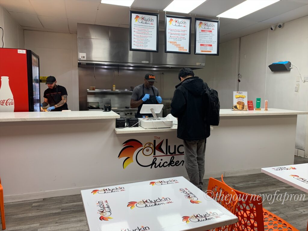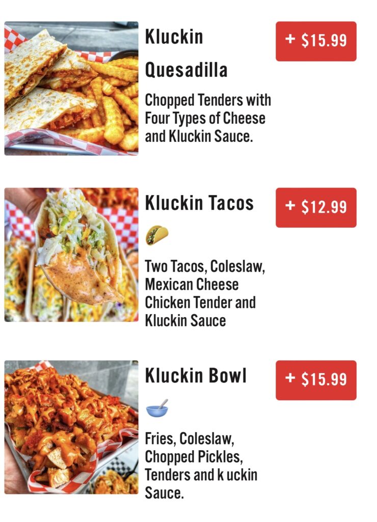 店家提供的菜色很多元,炸雞柳除了可以搭配華夫餅,也可以選擇墨西哥薄餅(Quesadilla)或墨西哥玉米餅(Taco)。大雜燴金碗(Kluckin Bowl)也很特別,就是大碗裡裝滿薯條、涼拌捲心菜、泡菜、雞柳條和醬汁,完全是健達出奇蛋多種願望一次滿足的概念。如果想吃比較傳統的漢堡和炸雞翅這裡也都有,至於飲料就是各類汽水和瓶裝水而已。