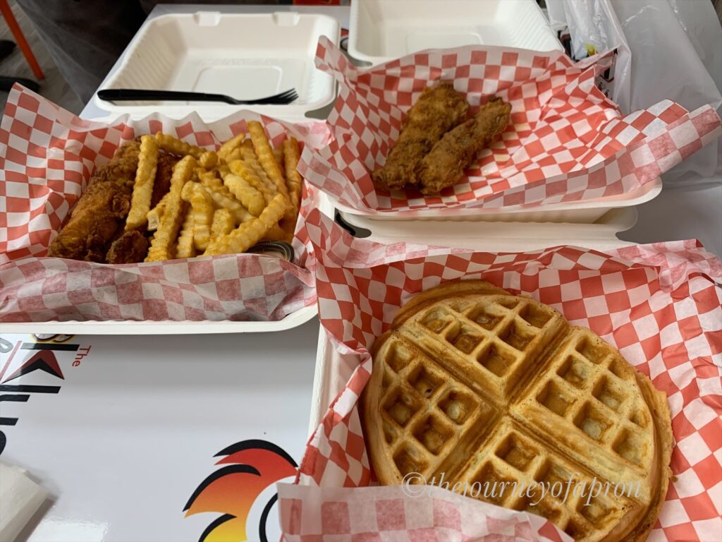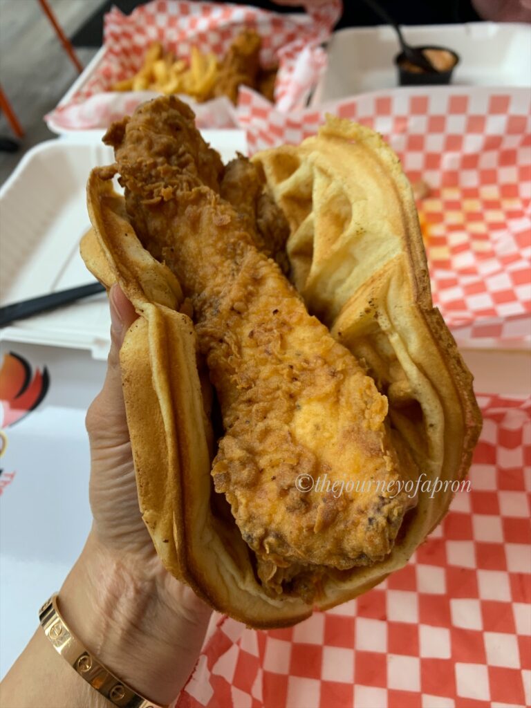 我點的是兩塊雞柳條配華夫餅(2 Tenders 1 Waffle),US$15.99。隨性發揮創意用waffle包卷雞柳條,外層是鬆軟而微甜的餅皮,裡面是香辣多汁的雞柳,這組合竟然毫無違和感,甚至可以說是很美味,不管是淋一點華夫餅專用的蜂蜜、或是灑些胡椒粉都不錯,而且飽足感很強,絕對能吃飽;大胃王等級的朋友也可選擇兩片華夫餅配兩塊雞柳的套餐,價錢是$21.99。單片華夫餅的價格是$7.99,算一算還是買套餐比較划算。