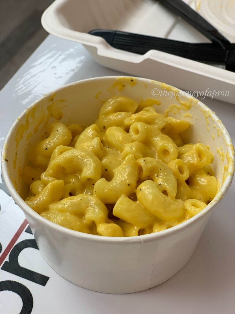 店員是一整個很high,邊聽音樂邊工作,還順便搖擺起來!我從進店到吃飽離開,完全沒看他好好走路過,不管移動到哪裡去,他都是滑步加轉圈、扭屁股。其實我猜這個愛跳舞的男生就是店東,他先是送我一瓶水,後來又贈送兩碗creamy mac and cheese,三樣贈品加起來超過十塊錢,如果是店員,被老闆抓到他對客人這麼慷慨,大概會被扣薪水。