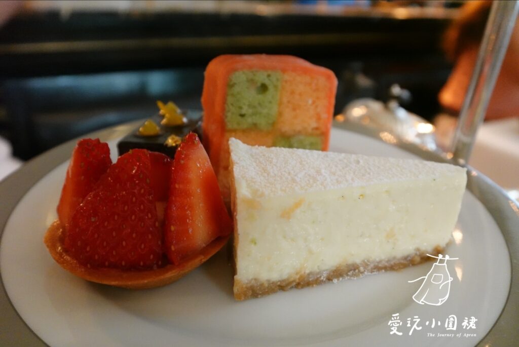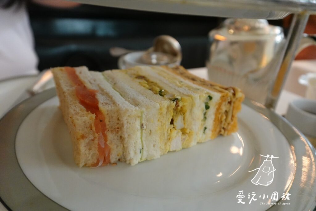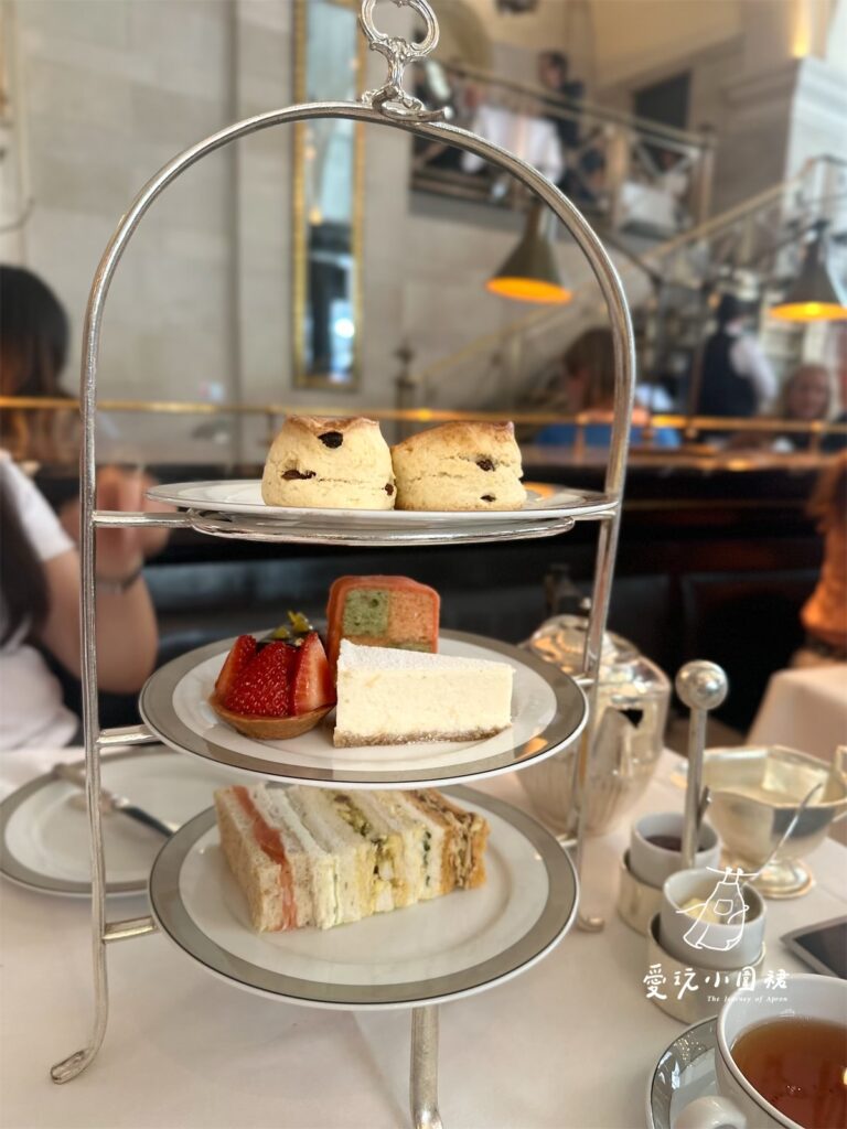 最下層則是手指三明治,煙燻鮭魚、黃瓜、蛋沙拉等口味精緻多樣,中間層是色彩繽紛的甜點,草莓塔、起司蛋糕與經典 Battenberg;上層是熱騰騰的司康,搭配凝脂奶油與果醬,為整場下午茶劃上最經典的符號。
